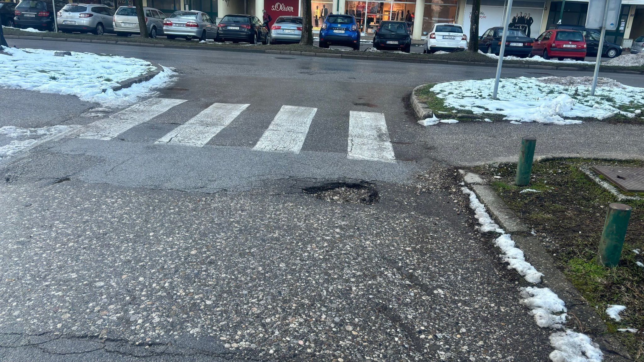 Rupa na ulazu u ulicu za parkiranje. Dovoljno siroka i duboka da kotac upadne te se osteti auto