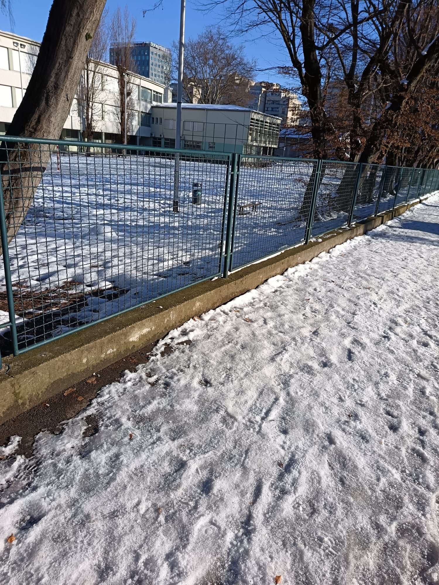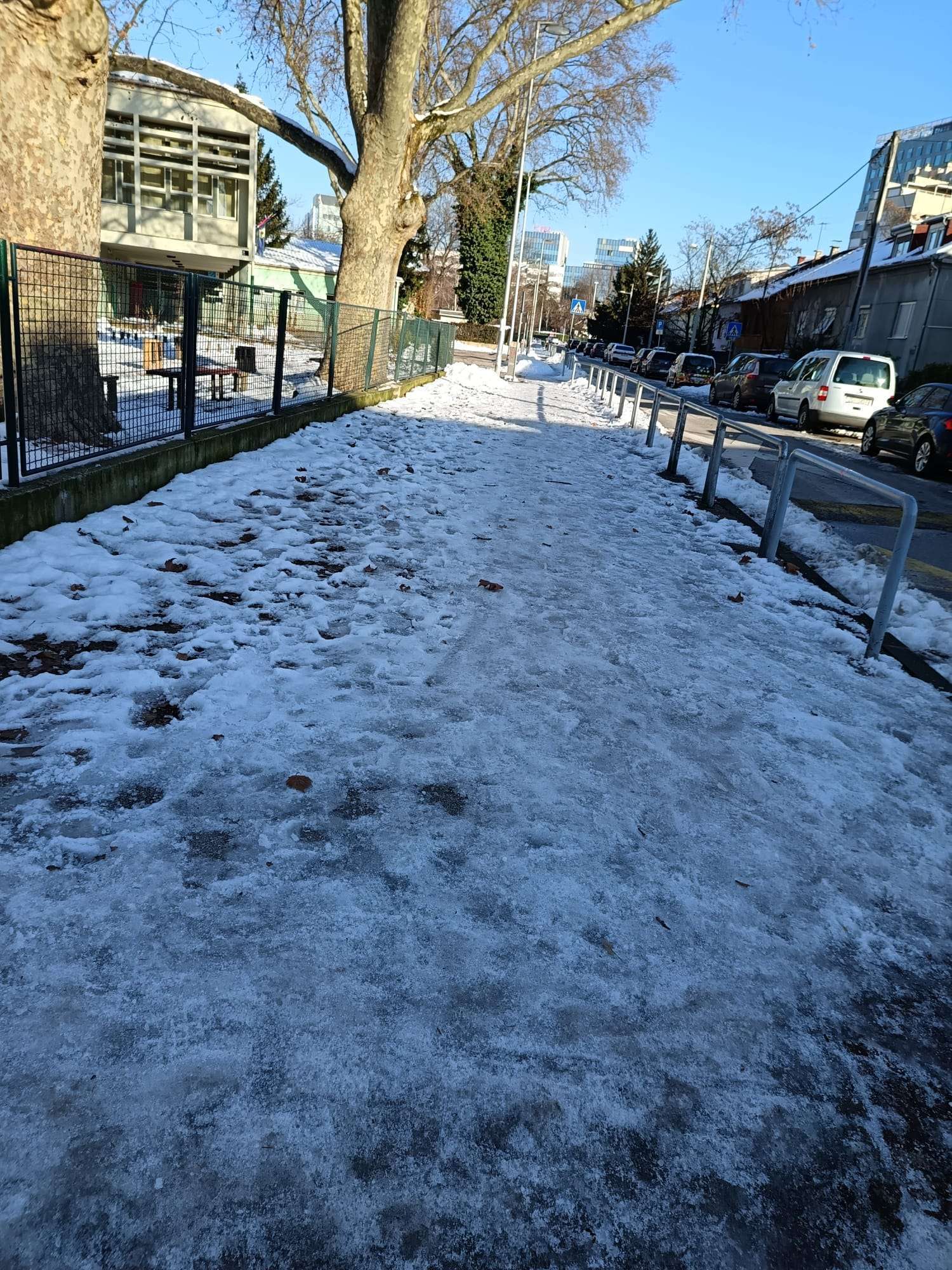 Sutra počinje škola a pješačke staze oko škole Rapska, kao i škole Marina Držića nisu očišćene zbog čega se pri niskim temperaturama stvorio led na stazama.
