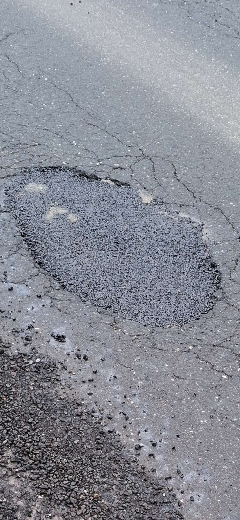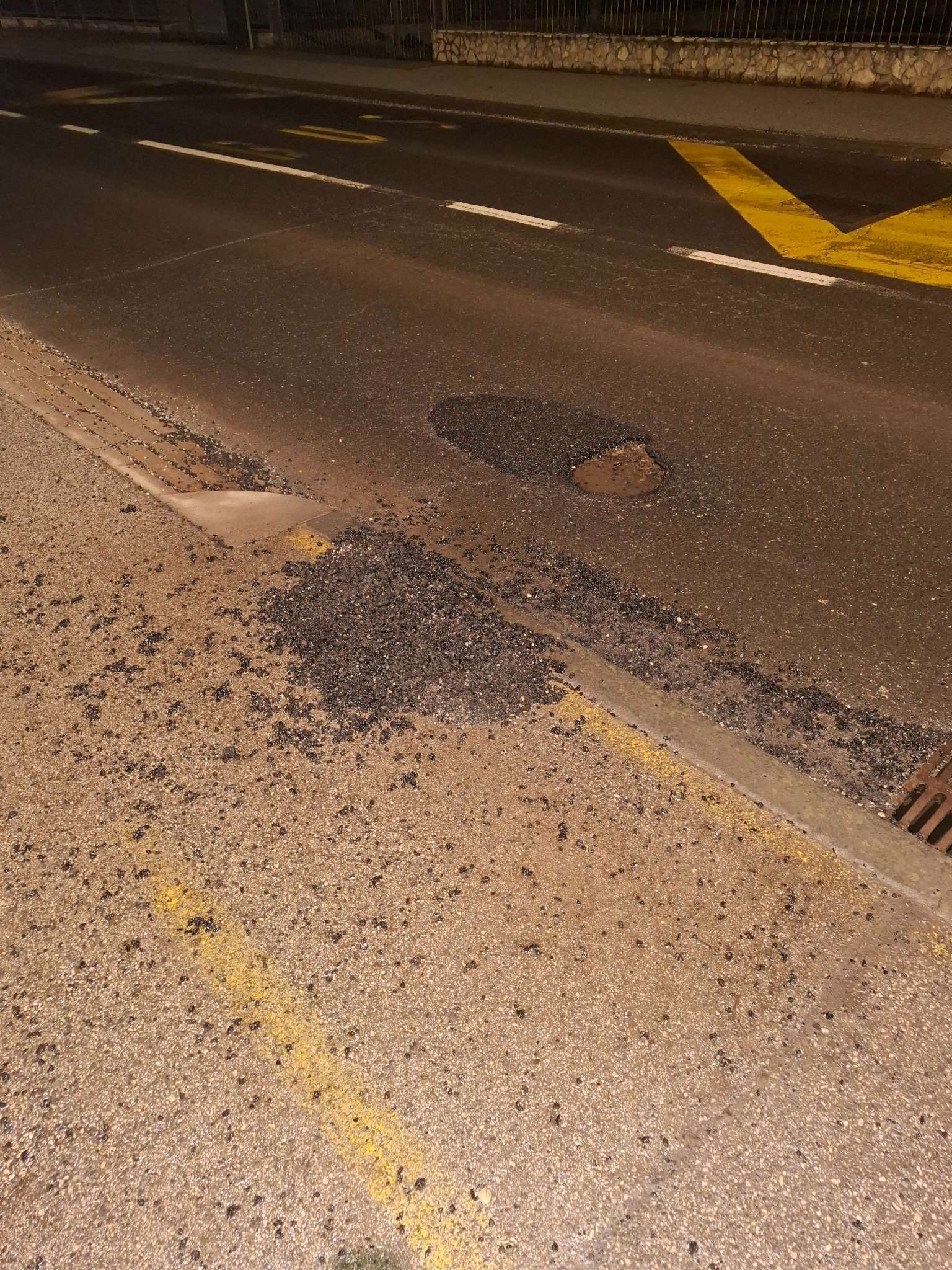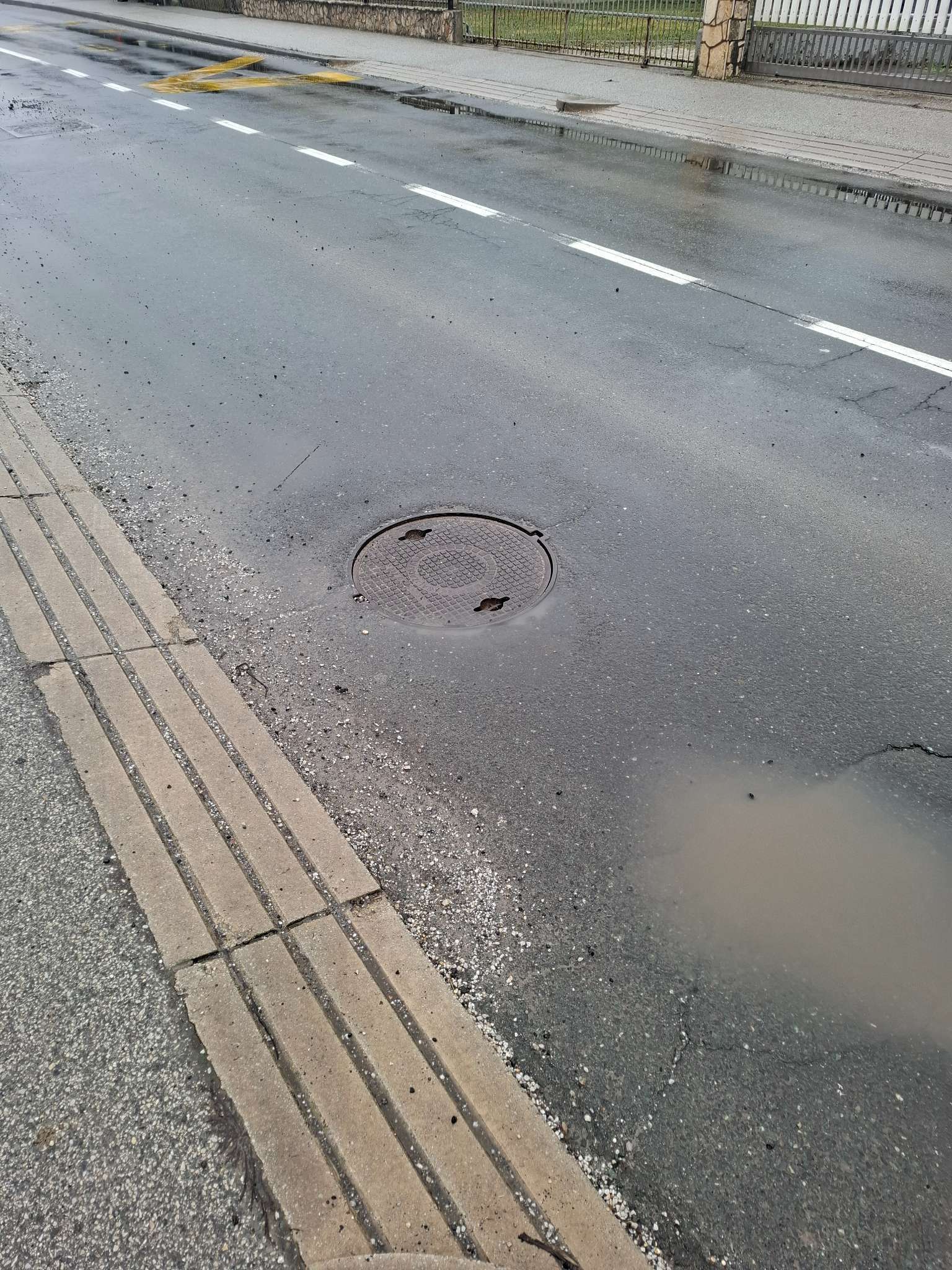 Pokrpano danas neadekvatno na mokru podlogu lopatarenjem..zakrpa vec propala u odnosu na cestu..oko zakrpe ispucan asfalt koji ce se opet izvaliti za par dana..zakrpa niža od šahta..a asfaltno kamenje ne očišćeno..te opet gađa pješake pd kotačima auta..a kamenje sve rasipano do odvoda vode..pa nema ni koliko toliko odvodnje...slična stvar 15 metara dalje na kč broj 83...